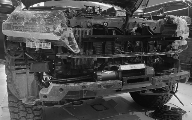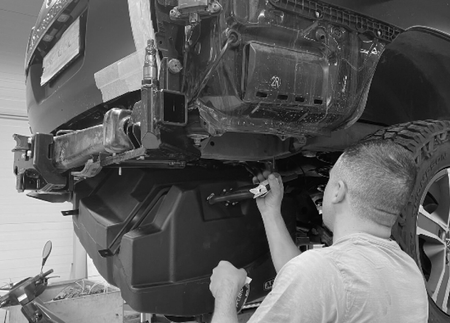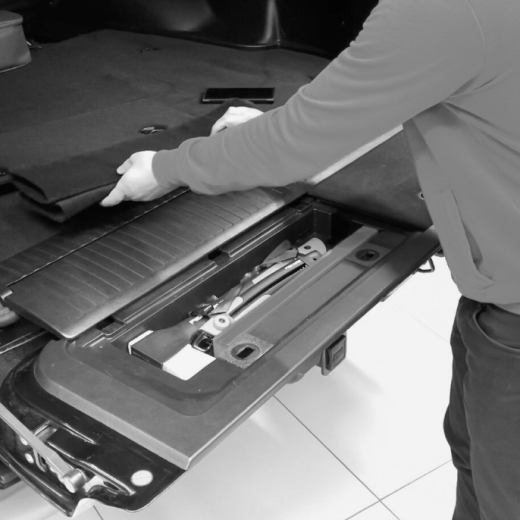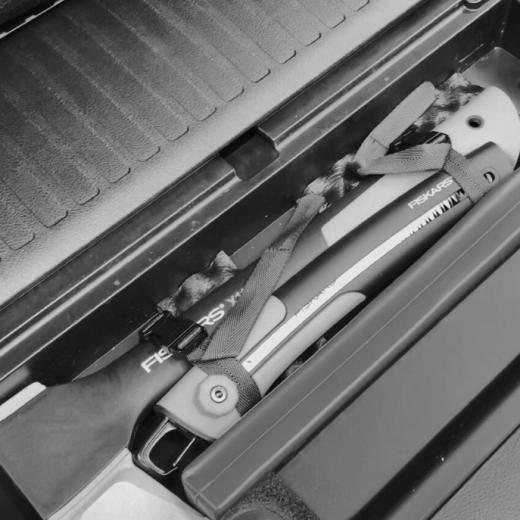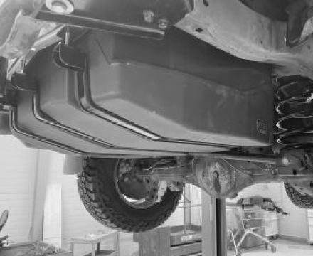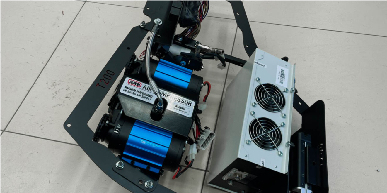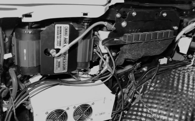Компрессор, рация, инвертор, блок пневмоклапанов, ресивер, блок реле для всего доп. оборудования и блок предохранителей. Реле и предохранители расположены таким образом, чтобы у владельца был простой доступ для инспекции и обслуживания через крышку.